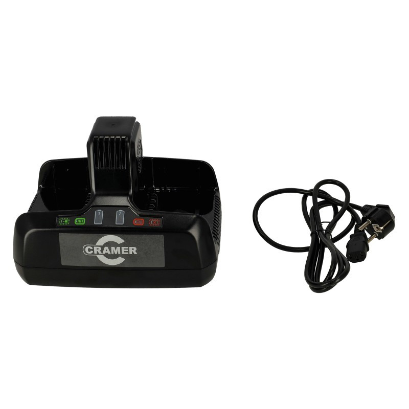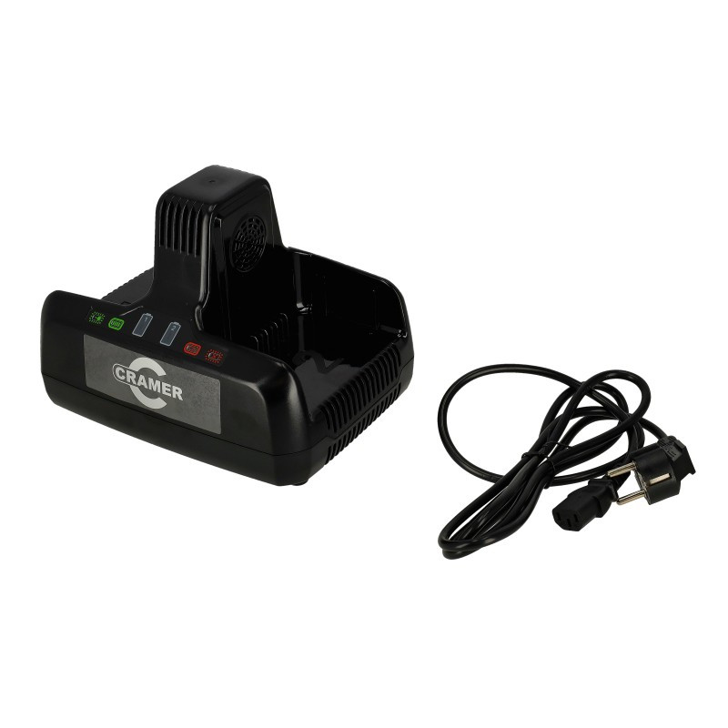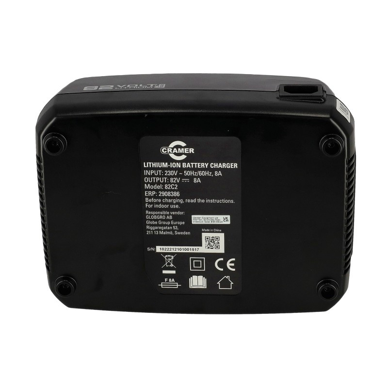 A töltő beépített akkumulátorhűtéssel és LED-es töltésállapot-jelzőkkel rendelkezik, amelyek biztosítják a gyors, biztonságos és jól követhető töltési folyamatot. A készülékhez levehető EU és UK tápkábelek tartoznak, és teljes mértékben kompatibilis az összes Cramer 82 V-os professzionális akkumulátorral.