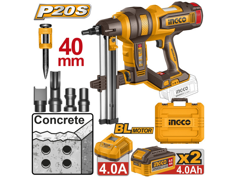 INGCO akkus beton szögbelövő 40 mm, szénkefe nélküli, 20 V (2×4,0 Ah akkumulátor + töltő)