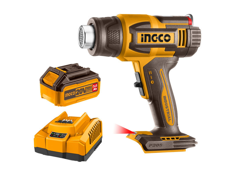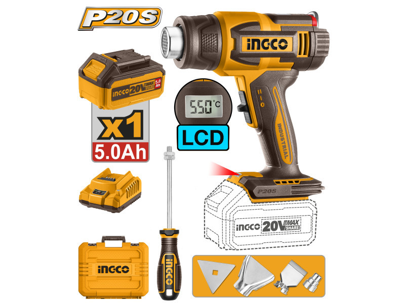 INGCO Akkus hőlégfúvó 550°C LCD kijelző 20 V (1 x 5,0 Ah akku + töltő)