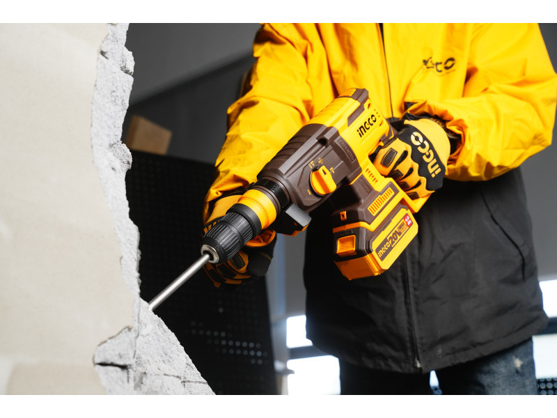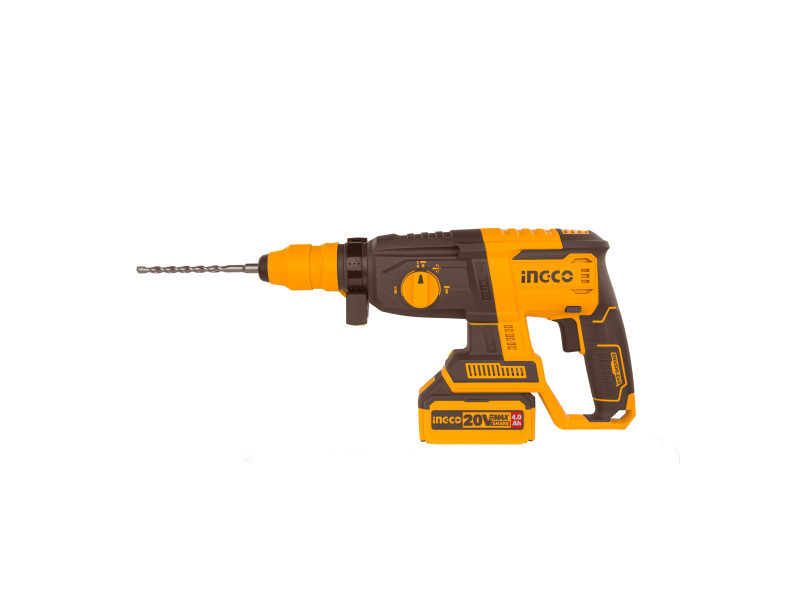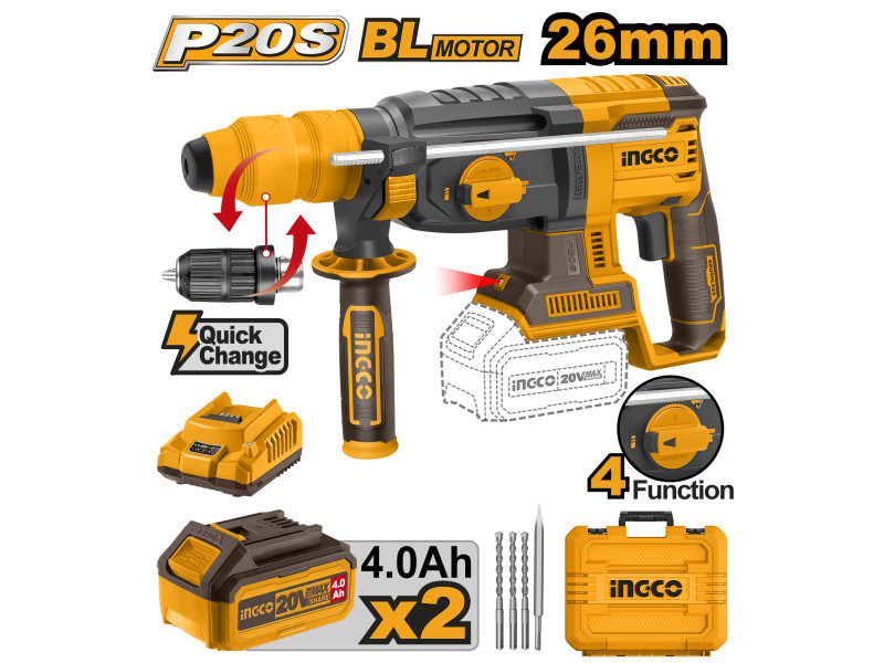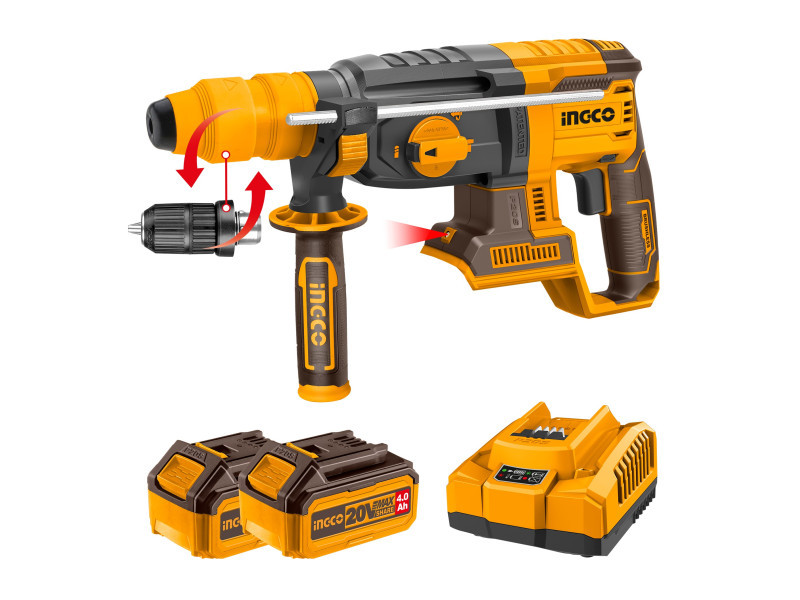 INGCO Akkus kombikalapács 2,5 J SDS-Plus szénkefe nélküli 20 V (2 x 4,0 Ah akku + töltő) cserélhető gyorstokmánnyal a hengeres szárú fúrók használatához