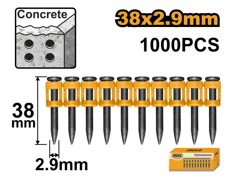 Az INGCO 38 mm-es betonszegek nagy szilárdságú acélból készültek, és kifejezetten betonba, téglába és más kemény építőanyagokba való gyors, erős és tartós rögzítésre szolgálnak. Ideálisak szegbelövő gépekhez, professzionális építőipari munkákhoz és szerelési feladatokhoz.