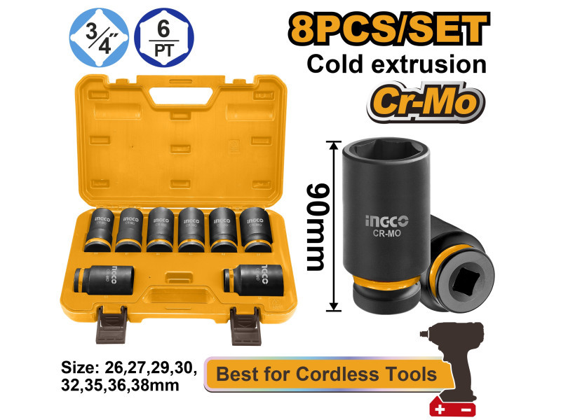 INGCO Gépi hosszú dugókulcs készlet 8 részes 3/4" 26-38 mm CrMo