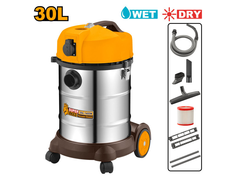 A 1400 W-os, rézdrótos motor erőteljes és tartós működést biztosít, a 16–18 kPa szívónyomás pedig könnyedén megbirkózik a finom porral és a nagyobb szennyeződésekkel is. A 30 literes rozsdamentes acél tartály nagy kapacitást kínál, és alkalmas a folyékony és szilárd hulladék ideiglenes tárolására, amelyet később egyszerűen, egységesen lehet üríteni.