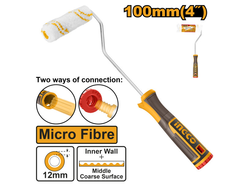 INGCO mikroszálas festőhenger nyéllel – 100 × 12 × 6 mm, lágy fogantyús