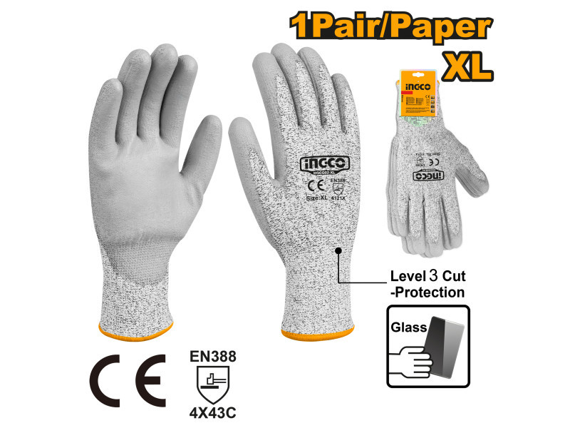 INGCO munkavédelmi kesztyű XL – vágásbiztos, PU mártott (3/C)