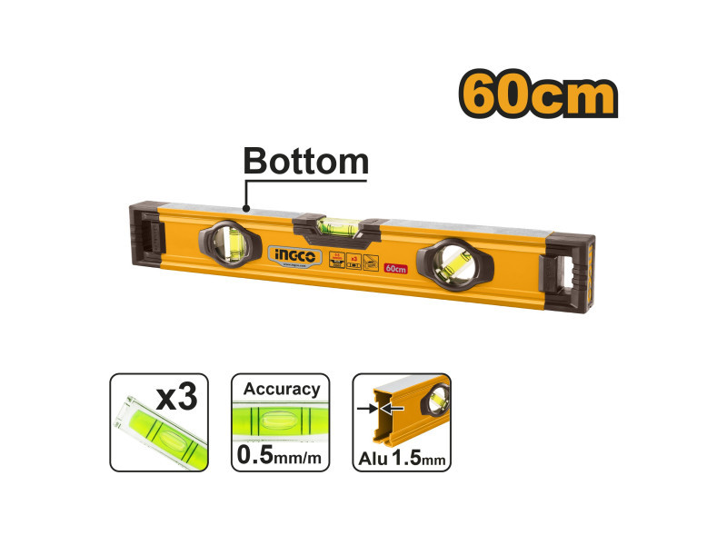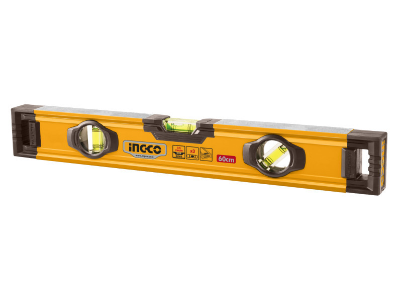 Az INGCO 600 mm-es vízmérték alkalmas vízszintes, függőleges és egyéb szögben történő mérésekhez. A három nagy pontosságú libellának köszönhetően többféle mérési igényt is kielégít, miközben masszív kialakítása pontos és megbízható használatot biztosít építőipari és szerelési munkák során.