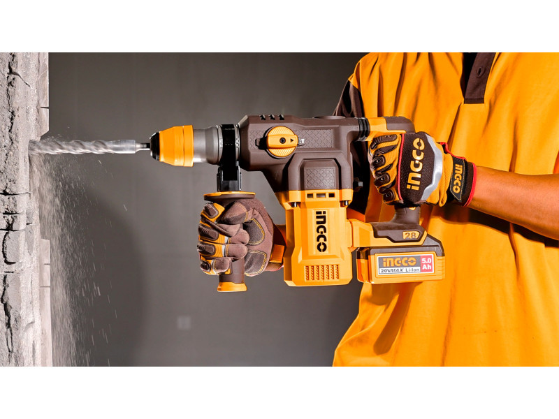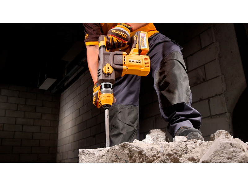 Az SDS-Plus befogás gyors és szerszám nélküli szárszerszám-cserét tesz lehetővé, míg az akkumulátoros kialakítás vezetékmentes használatot kínál. A készülék az INGCO 20 V-os akkumulátoros rendszerének része, ezért kompatibilis a meglévő INGCO akkumulátorokkal. A termék akku és töltő nélkül kerül forgalomba.