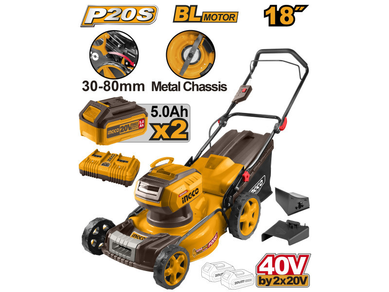 INGCO Akkus fűnyíró 460 mm 2 x 20 V szénkefe nélküli (2 x 5,0 Ah akku + 4,0 A dupla töltő)