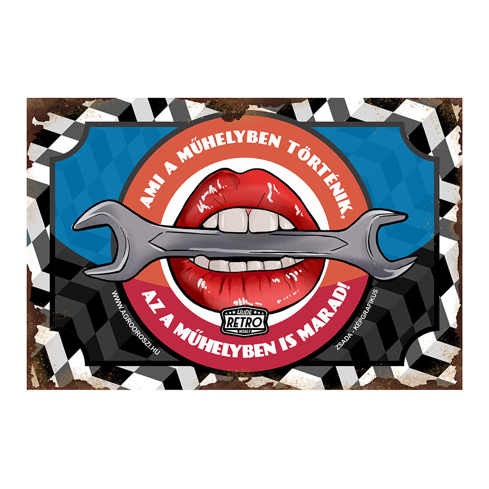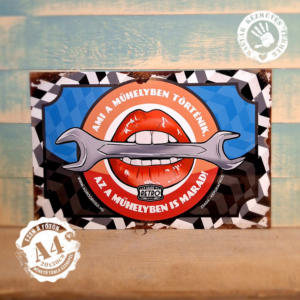 Retro fémtábla - Ami a műhelyben történik - kék - A4 - 20x30 cm - PREMIUM